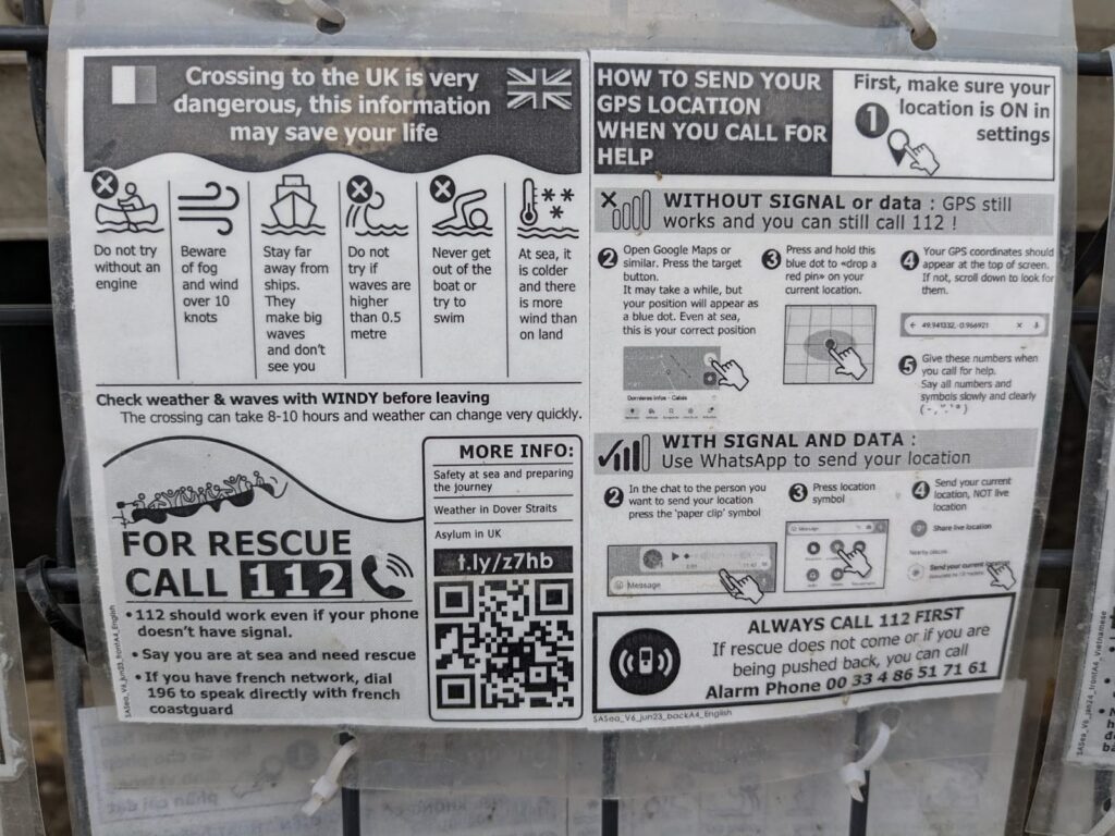 Roots display an information stand every day, translated into a multitude of languages. One of the flyers outlines safety warnings about crossing the Channel. Although I thought I was relatively well informed, I was shocked to read that the crossing can take eight to ten hours — in the dark, trying not to be spotted while also dodging huge ferries in one of the busiest stretches of water in the world. All of this while sitting in an open-topped, overcrowded boat, with no protection from the elements. I cannot imagine the fear and the cold that accompanies every minute of that journey.